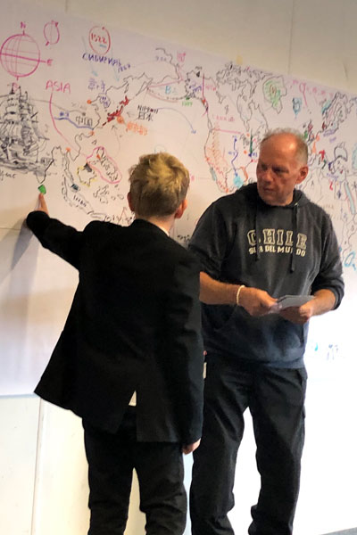 Neal beings the Gameshow by drawing the world from memory, as he draws he provides an insight to the diversity and history of many countries around the world. He uses this as a focus for not only promoting Geography and students' understanding of place but also for inspiring our students to want to learn.