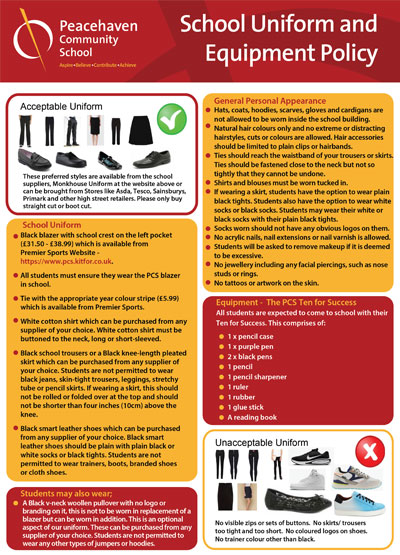 At Peacehaven Community School we have high expectations of our students and in this educational setting uniform plays an important role. We are committed to equity of opportunity; each young person has different circumstances and resources and we provide students with opportunities to ensure they reach an equal outcome. We want all students to be treated with respect and according to their actions, not by what they look like. Our uniform is an important part of this.